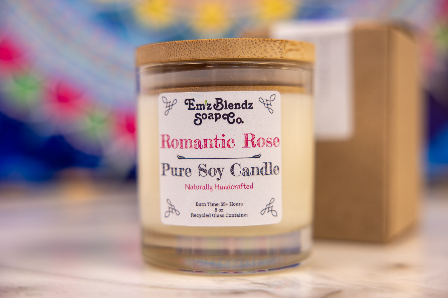 Experience the enchanting scent of freshly cut roses with our Romantic Rose Candle. Perfect for creating a classically romantic atmosphere, this candle is made with pure rose essential oil, known for its intriguing and captivating fragrance. Em'z Blendz hand-poured candles are crafted with 100% natural soy wax and pure cotton wicks, ensuring a clean and even burn. Our signature scent blends fill your space with a delightful aroma that is never overpowering.